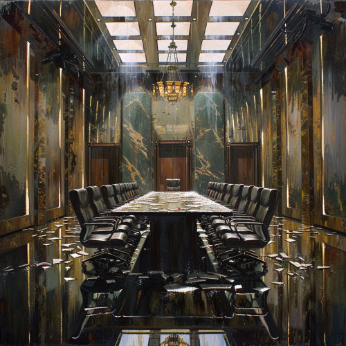 A normal well lit boardroom with a long conference table, filled with executives in black and grey suits. The room has a , corporate feel with dim lighting and a serious atmosphere. The executives appear monotonous. Camera lens: 50mm for a medium shot capturing the uniformity. Lighting: Cool, muted tones with shadows to emphasize the drabness. Angle: Eye level to capture the uniformity.