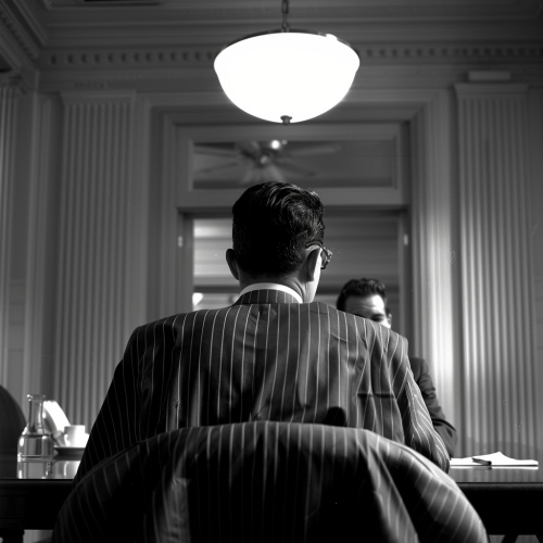 movie still, documentary photography, editorial, a businessman in a meeting, wearing a pinstripe cape