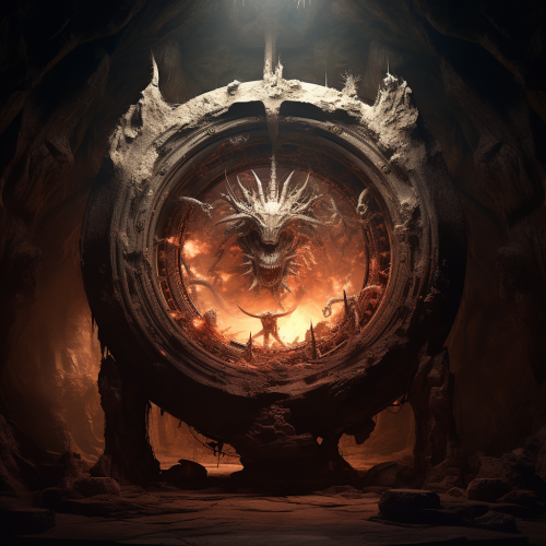 a magic circle with a dragon skeleton inside, in a cave, fantasy setting