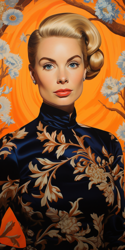 Portrait of Grace Kelly, oil painting, in the style of Kehinde Wiley, with intricate patterned background --ar 1:2