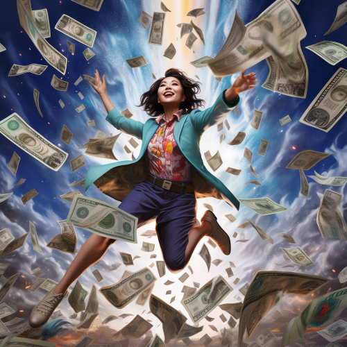 photo of a beautiful polynesian woman standing in the jungle with the wind blowing money through the air: dramatic lighting, US dollar Bills, --ar 16:9