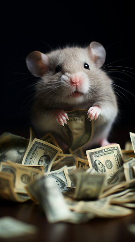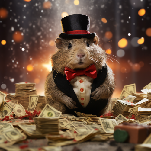 a lemming dressed in a suit with a red bowtie with piles of gold and stacks of dollar bills