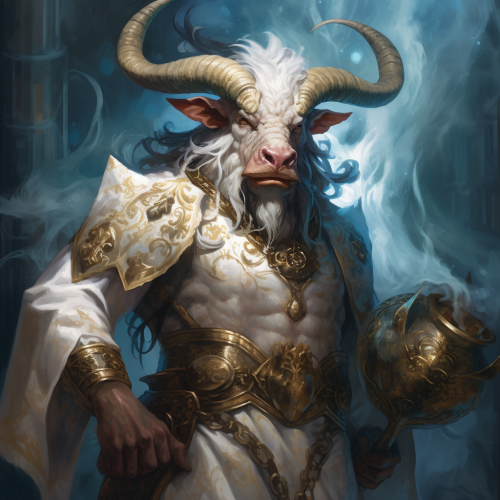 A massive minotaur with a blue glow emanating from intricate patterns on their white fur. brass on his horns and hooves. wearing a greasy stained white apron and crumpled chefs hat. Cosmic spice pouches hanging from their belt, Leaning casually against a starship, with a mischievous grin.