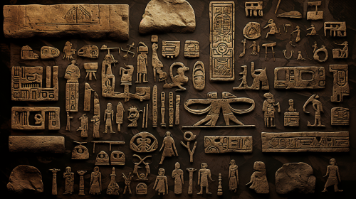 An ancient engraving of migrating tribes in 300 AD, families and warriors travel across a barren landscape, wooden carts, cattle, and rocky mountains in the background. A tall, dark figure with a white, emotionless mask is hidden within the shadows of a wagon. Engraving style: intricate stone relief carving, detailed textures, subdued lighting, historical accuracy --ar 140:99 --v 6.0