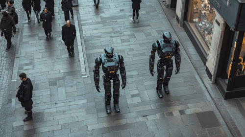 photo shooted by drone 5 meters of height in parametric prospective of street in milano with peoples and black modern humanoid robots walking --v 6.1 --ar 16:9