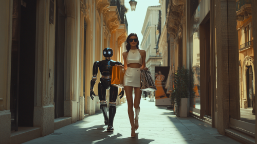Drone photo at 3 meters height of a wealthy fashion woman walking on Montenapoleone sidewalks, followed by her sleek black humanoid robot carrying Hermes shopping bags. Stylish boutiques in the background, soft sunlight casting shadows, cinematic style --ar 16:9 --v 6.1