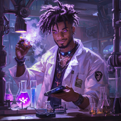 a good looking, smug, intelligent young black man with brown skin, dark purple eyes, no beard, slender frame, dreadlocks styled in a mohawk and dyed purple, dressed like a scientist, wearing a smirking expression, in a laboratory surrounded by beakers and test tubs, he’s holding a remote control that looks very high tech, and a symbol of an elephant on the bottom of his lab coat.