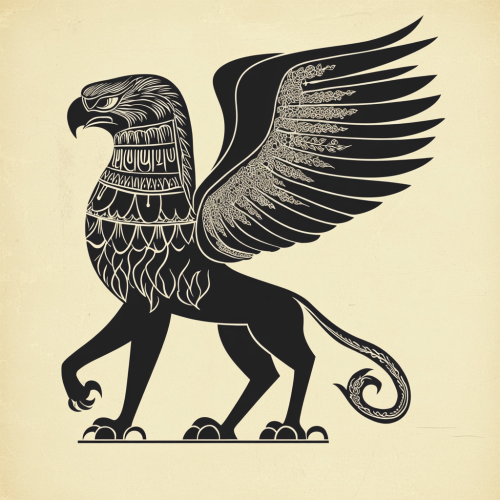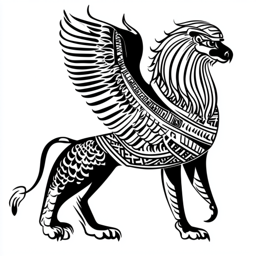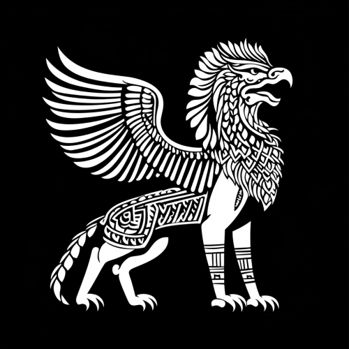 A very simple and minimal 2D black and white vector design of a griffin inspired by the Persepolis Griffin. Simplified, yet maintaining Persian architectural details, with a focus on clean lines and geometric forms. The body should reflect the classical Persian winged creature, featuring detailed wings, lion's paws, and lion's head, with ancient Persian patterns subtly engraved on the body and wings. The design should have an elegant and balanced composition, merging traditional elements with a modern, minimal aesthetic, set against a plain background.