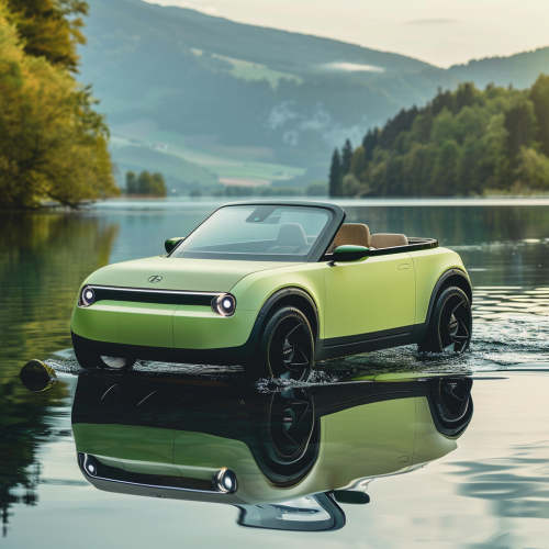 a small electric dull green amphibious convertible coupe with striking EV design with powerful clean and minimal design language in a lake, press photo cinematic