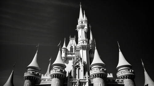 A black and white close up photograph of a disney castle, in the style of abstract minimalism, negative space, kodak porta 800 --ar 16:9