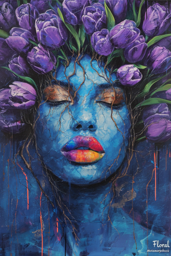 a floral Metamorphosis is a symbolic and abstract representation of a woman's face transforming, blending elements of nature and surrealism. The artwork portrays the woman's inner beauty and strength, symbolized by the rooted tree hair while celebrating her multi-faceted identity with rainbow lips. Purple tulips, known for their symbolism of admiration and enchantment, frame her face, adding a touch of elegance and mystique. Composition: Face: The woman's face is rendered in an abstract, cubist-inspired style reminiscent of Picasso's work. The facial features are fragmented, creating an intriguing interplay of shapes and forms. The use of cool and soothing colors like blues and purples accentuates the surreal atmosphere. Purple Tulips: Surrounding the woman's face are vibrant purple tulips, their petals curving and twisting in a harmonious dance with the contours of her visage. These tulips symbolize the admiration and enchantment that the viewer experiences when gazing upon her. Rainbow Lips: The woman's lips are the focal point of the artwork. They are painted in a mesmerizing rainbow of colors, representing her diverse and multifaceted identity. The lips exude confidence and individuality, challenging conventional beauty standards. Rooted Tree Hair: Emerging from the top of her head, the woman's hair takes on the appearance of a rooted tree. The tree's branches and roots intertwine with her hair, symbolizing her strength, resilience, and connection to nature. The roots extend downward, grounding her in her identity and values. Interactivity: To enhance viewer engagement, the artwork can incorporate subtle, shifting LED lights that illuminate the tulips and the rainbow lips, creating a dynamic interplay of colors. As viewers approach, the lights intensify, [...]