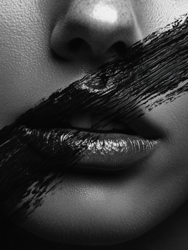 Hyper-realistic, highly detailed, high-resolution black and white photo of a female face. The image emphasizes the extreme realism of the skin, showcasing visible pores, fine lines, and detailed texture, especially around the lips. A vertical black brushstroke is painted across the lips, creating a striking visual contrast. Focus on the skin's details and texture as the primary element of the image. --ar 3:4