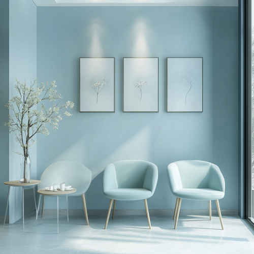 create a waiting room-like interior using a light blue with an RGB colour value of R: 171, G: 200, B: 239 as a monochromatic colour scheme, with 1 or 2 small light sage green accents with RGB values o R: 185, G: 225, B: 192, the atmosphere is calming, gentle and relaxing, it must benefit mental health, interior design, interior architecture