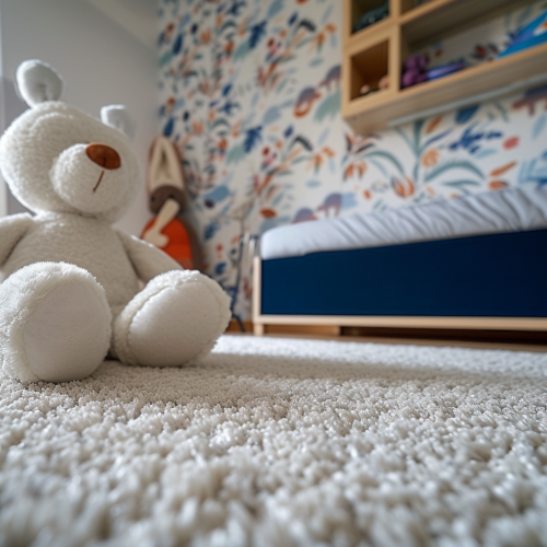 close up of contemporary child room , minimal decor, home living, the child wallpaper is very clean, , the lens is straight, the hand crafted modern carpet, on a wooden floor is in the center of the lens, style raw-s 750, the picture details are rich and real --ar 1:1 --style raw --v 6.0