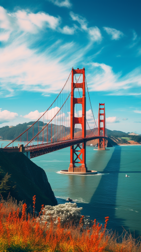 golden gate iphone wallpaper, cinematic, bright sky, green grass, deep blue ocean, highly saturated --ar 9:16