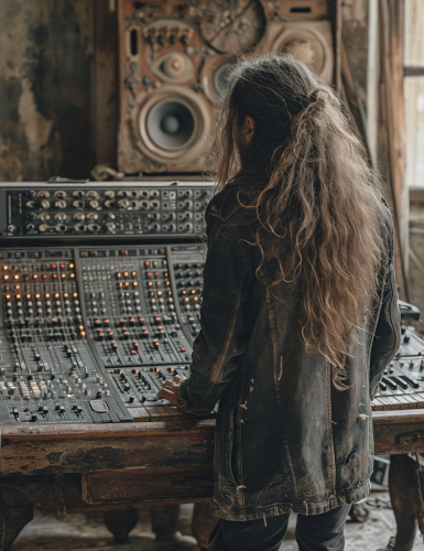 a man with long hair sitting in a chair with an electronic mixer, in the style of paolo roversi, grandeur of scale, klaus pillon, modular, bill gekas, studio portrait, monumental ensembles --ar 99:128 --style raw --stylize 750 --v 6.0
