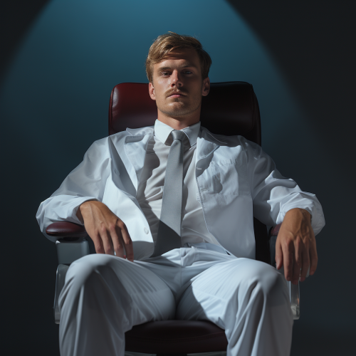a photo of a man in a suit sitting on a comfortable chair in complete darkness facing the camera. he is illuminated by one big soft light and the background is completely dark. the focal length of the lens is 50mm and it is a super wide angle shot. --ar 16:9 --s 250