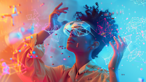 A business professional in an abstract digital environment, with hyper-realistic expressions and gestures as they interact with AI-driven tools for content planning. Surrounding them are floating, holographic visualizations in #00b398 and #62165c, representing automated content calendars, persona insights, and trend predictions, capturing AI’s transformative power in B2B content marketing., cinematic, hyperrealistic --ar 16:9 --v 6.0