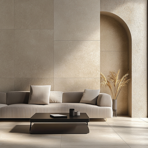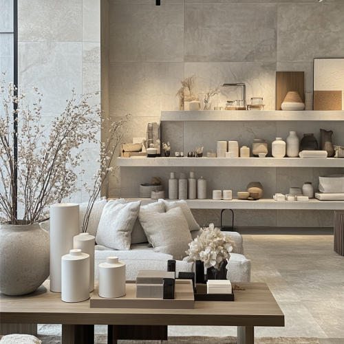 Create an image of a minimalist home accessories store with modern design. The color palette should feature shades of grey and natural stone tones, giving the space a sleek and sophisticated feel. The walls and floor should be made of smooth stone materials, complementing the overall minimalist aesthetic. Display a variety of home accessories, such as decorative vases, candles, and stylish organizers, on clean, open shelving. The accessories should blend with the store’s modern design, emphasizing simple lines and subtle textures. Lighting should be soft and warm, enhancing the minimalist atmosphere without distracting from the products.