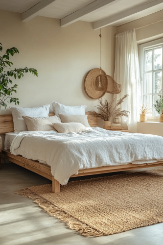 Illustrate an earthy minimalism barndominium master bedroom that combines simple lines with natural colors and materials. The bed should be low to the ground and made from natural wood, dressed in organic cotton or linen bedding. Keep decorations to a minimum, focusing on quality and sustainability. Natural light should play a significant role in the room, highlighting the clean, organic feel. This image should draw viewers interested in a minimalist approach that still feels warm and grounded. Neat and organized. Camera: DSLR - Canon EOS 5D Mark IV. Lens: Canon EF 24-70mm f/2.8L II USM. Composition: Wide shot, room-centered, horizontal orientation, balance between furniture and space. Film: Digital, high resolution, color profile sRGB. Camera settings: ISO 400, f/2.8, 1/60 sec. --ar 2:3 --v 6.1 --s 250