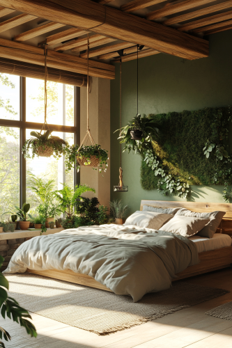 Interior design bedroom, organic natural colors and tones, beige, moss green, slate stone, with hanging plants and a green wall. Wooden ceiling, ambient light, sun rays spilling through the windows. --ar 2:3 --v 6.1