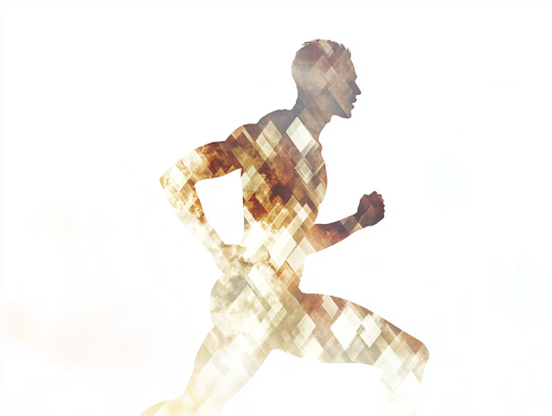 generate a simplistic minimalist collage, inspired by pop art and kusama. the subject is: a female track athlete with short masculine hair. vibrant flat three tone colors with a color palette of: pink and blue and black. multilayered, retro, creative and artistic --v 6.1