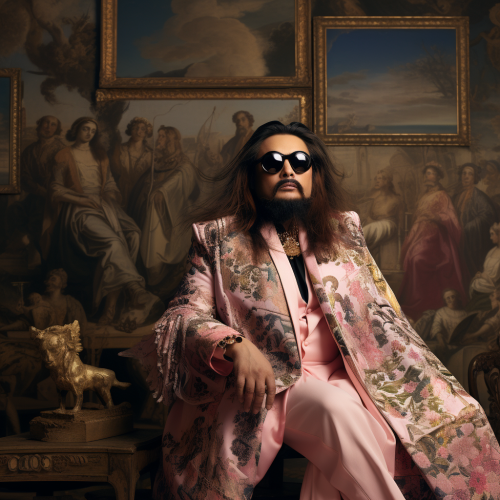 ginewhite and pastel VOGUE editorial of real Bappi Lahiri with eye wear, long hair and iconic gold jewellery dressed in an Alexander Mcqueen against a mattise painting in a met gala cape & suit in a monochromatic vogue cover shot on Hasselblad with a 35mm lens. Lighting: Cinematic surreal lighting, Behind Bappi is a hand-painted muslin backdrop. Its design draws inspiration from a Matisse painting - dreamy, poetic.