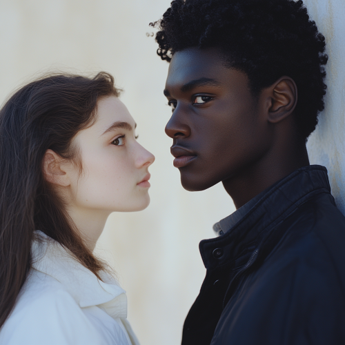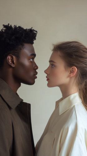 A black young man facing a white young woman, head and shoulders, modern clothes, minimalist editorial for wallpaper magazine by James Bidgood . Muted colors, moody aesthetic, monochromatic color palette, soft lighting, cinematic, photorealistic, hyperrealism, depth of field, medium wide angle plain beige background, style raw, --ar 9:16