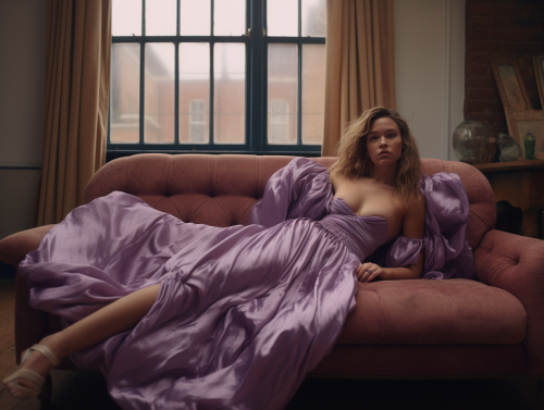 A British model in her early 20s lies on a huge couch, Vogue editorial photoshoot, mainly purple colour, confident, wide angle, full body shot, overcast, fujifilm, livingroom, realistic, 8k, --v 5.2 --style raw --ar 4:3