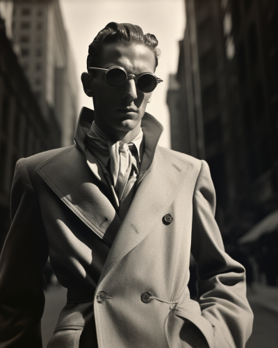 A high resolution photo-realistic black and white fashion photograph of the Invisible Man from the 1933 film with white cloth strip wraps covering his chin, nose and forehead wearing sunglasses modeling a grey overcoat standing on a New York street with the jacket open. Shot from a front angle perspective with a shallow depth of field. --ar 4:5