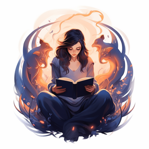 Flat 2d toon minimalistic illustration + a woman reading a magic book with magic and lights, white background, isolated, isolated, featured on artstation
