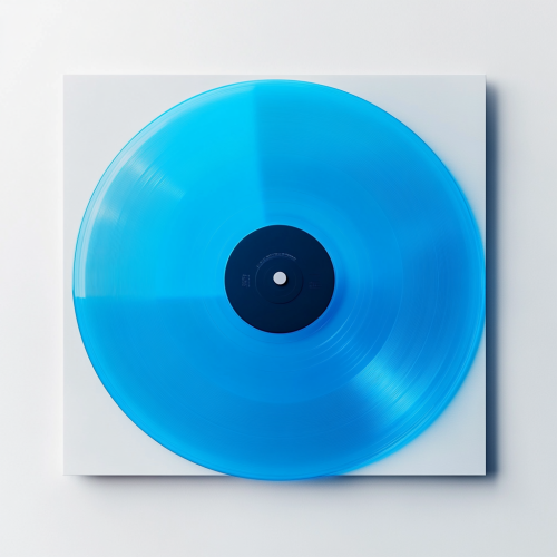 minimalistic flat shot of a vinal with futurictic techno volume; Location: white background, heart in center of vinal; key colors: blue gradient, flat angel shot; 50mm shot, the shot is flat , no pespective , high quality render; 4k --ar 1:1 --style raw