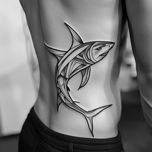 Black and white neo-traditional tattoo design of a shark viewed from above, wrapping from the back to the front of the torso. The shark has a streamlined, powerful body with bold lines outlining the fins and tail, flowing naturally across the back and curving around to the ribs and chest. Intricate shading creates depth and texture, with dynamic movement that wraps around the body. The design should emphasize fluidity, bold contrasts, and detailed line work in the neo-traditional style, covering the entire back and extending partially to the front.