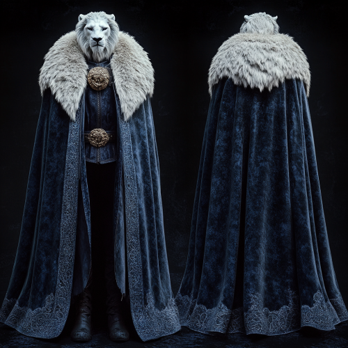 front view, side view and back view of an adventurers cloak, it is a fancy dark blue and the collar is made from thick white fur, with the head of a white lion sitting on the shoulder