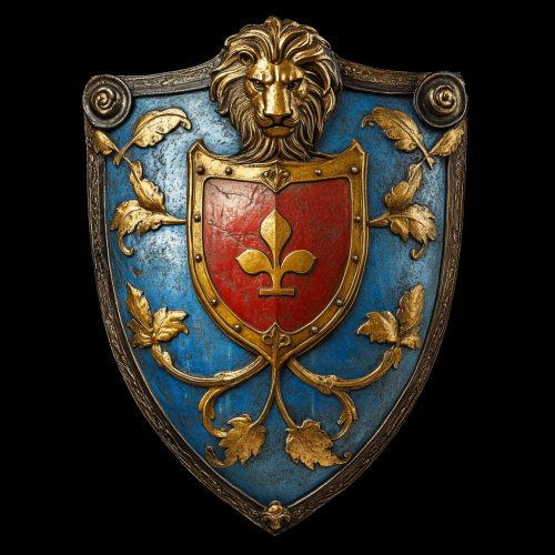a shield emblazoned, with a Field Partitioned, with Portion Dexter Azure containing a pierced cinquefoil argent, with Portion Sinister Sanguine containing Garb d'Or, overset by a Lion Regardant Tenne, all Supported.