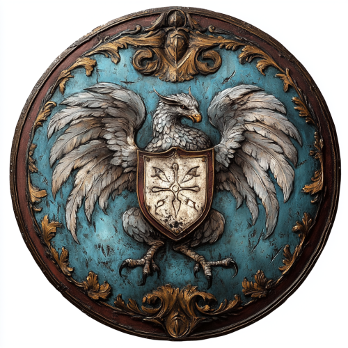 a shield emblazoned, with a Field Partitioned, with Portion Dexter Azure containing a pierced cinquefoil argent, with Portion Sinister Sanguine containing Garb Or, overset by Gryphon Regardant Tenne, all Supported.