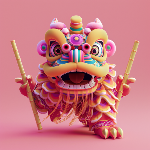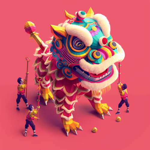 icon Dancing Lion. Chinese folk art. The lion dancers hold long bamboo poles and move like they are taming a wild lion. using my brand colors cian, magenta, yellow, 3d isometric render, in Fluent design style --v 6.0