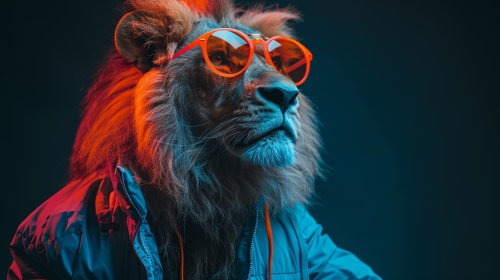 lion wearing an neon blue sports jacket and orange frame glasses with orange lenses, quarter profile, waist up --chaos 1 --ar 16:9 --stylize 250 --v 6.0