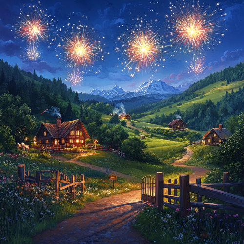 Huge beautiful hills, on the hills there are beautiful cottages, a closed cottage post-lock at the entrance to the village there is a barrier, next to a huge field with horses, bright fireworks above the cottage, a holiday, a detailed photo, pinpoint light, Hollywood style, there is a modern barrier on the bridge