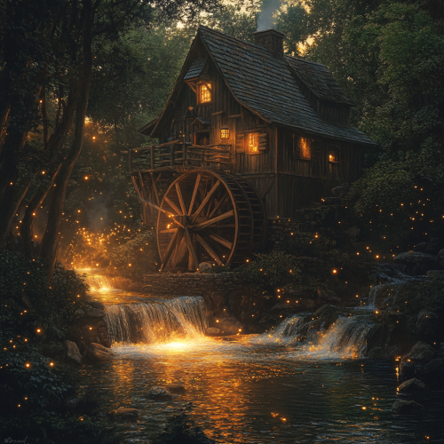 A rustic watermill in a mystical forest, with a glowing river turning the wheel, fireflies dancing in the air, and an inviting, warm light coming from the mill’s windows, 1:1 --v 6.1