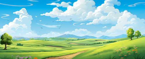 Abstract landscape with river, field, and hills