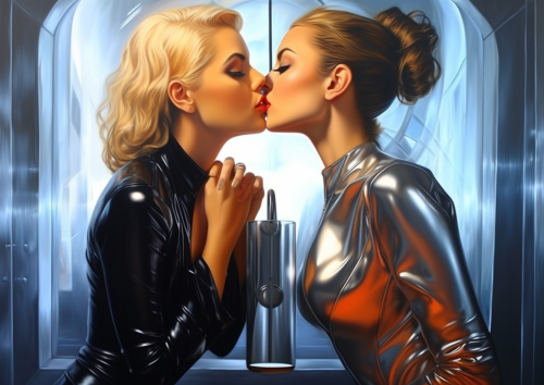 Portrait of two glamour women kissing with passion in a futuristic interior. oil on canvas. Contemporary art, photo-realism. James bond girls. Very detailled faces. --ar 70:50