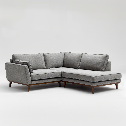 A professional corner look product photo on a white background with no shadows. The image features a gray sofa with a smooth surface and no tufting or quilting. Nikon lens f/2.8, 45.7MP, ISO 25600, 1 / Shutter 8000 --ar 1:1 --v 6.0