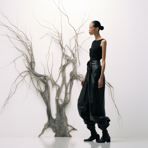 Asian skinny supermodel wearing Rick Owens clothes stands left side, more abstract clothes , ,there is an abstract tree by the side of her, It's an empty white studio, model integrated to the tree,all as beautiful as an ink painting, more intense but minimalist