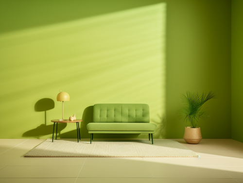 Simple japandi studio apartment, real estate photography style, minimalistic, modest, btight mood, vibrant, highly detailed, studio lighting, real image, realistic light, interior ambient lights, summer vibes, real estate marketing, architectural photography, lime green, green --ar 4:3