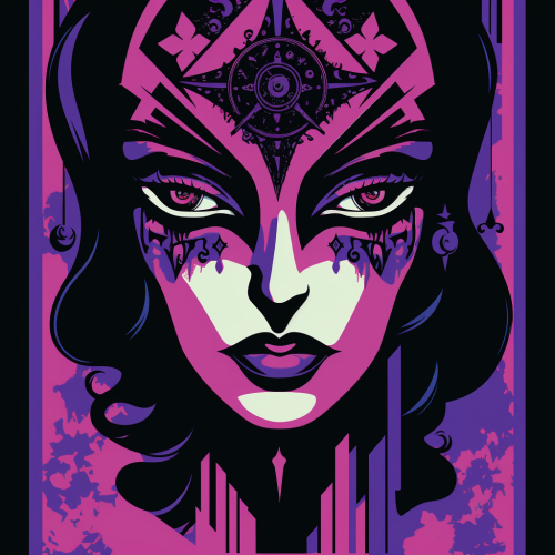 A collection of tarot cards featuring iconic horror movie characters in a vibrant, cosmic art style. Each card showcases a different character: 'The Slasher' with a menacing figure like Michael Myers, 'The Killer' featuring a doll-like figure resembling Chucky, 'The Dreamer' with Freddy Krueger, 'The Clown' with a sinister clown resembling Pennywise, 'The Camper' with a masked figure resembling Jason Voorhees, and 'Ghost Face' in the center with a haunting ghostly mask. The background is filled with colorful, dreamy clouds, stars, and celestial elements, combining a dark, eerie atmosphere with a psychedelic, outer-space theme. The tarot card frames are ornate, with intricate detailing, and each character is depicted with intense expressions and vibrant, glowing highlights. --ar 2:3 --quality 2 --stylize 750 --v 6.1