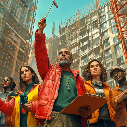 UHD photorealistic picture. A group of diverse, determined property owners, each holding different tools like a paintbrush, a wrench, and a clipboard, standing together in front of a large apartment building. They are positioned like an orchestra, with a leader in the center raising a conductor's baton, symbolizing unity and coordination. The background shows scaffolding and construction equipment, with a sense of collaboration and empowerment in the air, capturing the essence of collective property management