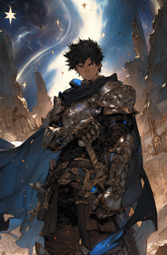 (masterpiece) (best detail possible) Four characters from an Isekai anime. 1) In the forefront is Shinichi Aizawa, a teenage human male knight with slightly unruly black hair and blue eyes wearing medieval armor but no helmet. Holding a sword and looking determined. 2) Behind him and slightly to his left is Ai, a green-skinned goblin girl with long straight white hair and violet eyes, also wearing armor. 3) To her right and again slightly behind Shinichi is Midori, a pretty teenage human girl with shoulder-length pink hair and blue eyes, also wearing armor. 4) In the back and centered between Ai and Midori is Raikos, a muscular anthropomorphic kimono white tiger warrior wearing silver metal shoulder guards. A weird pastel landscape is the background. Vector graphic illustration in the style of Studio Ghibli, 8k --niji 5 --ar 650:1010