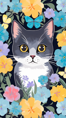 a cute cat, seamless pattern, poster style, glitch effect, surreal, abstract, geometric shapes, nature, moon, flowers, landscape, bright colors, pastel colors, digital collage, minimalistic, clean, modern, simple --ar 9:16 --c 20
