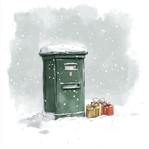 a simple sketch of a green post box that has some small presents on the ground beside it. There is a blanket of light snow over everything. Watercolour style